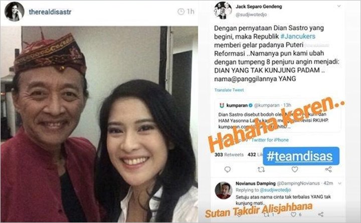 “Dengan pernyataan Dian Sastro yang begini, maka Republik #Jancuker memberi gelar kepadanya ‘Putri Reformasi. Namanya pun kami ubah dengan tumpeng 8 penjuru angin menjadi: Dian Yang Tak Kunjung Padam. Nama panggilannya Yang,” tulis Sujiwo Tejo.