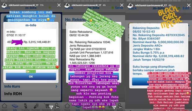 DEJABAR.ID – Artis kontroversi Nikita Mirzani pamer kekayaan dengan menunjukan foto capture rekening tabungannya, mulai dari tabungan, reksadana, dan deposito, yang nilainya lebih dari Rp 11 miliar.