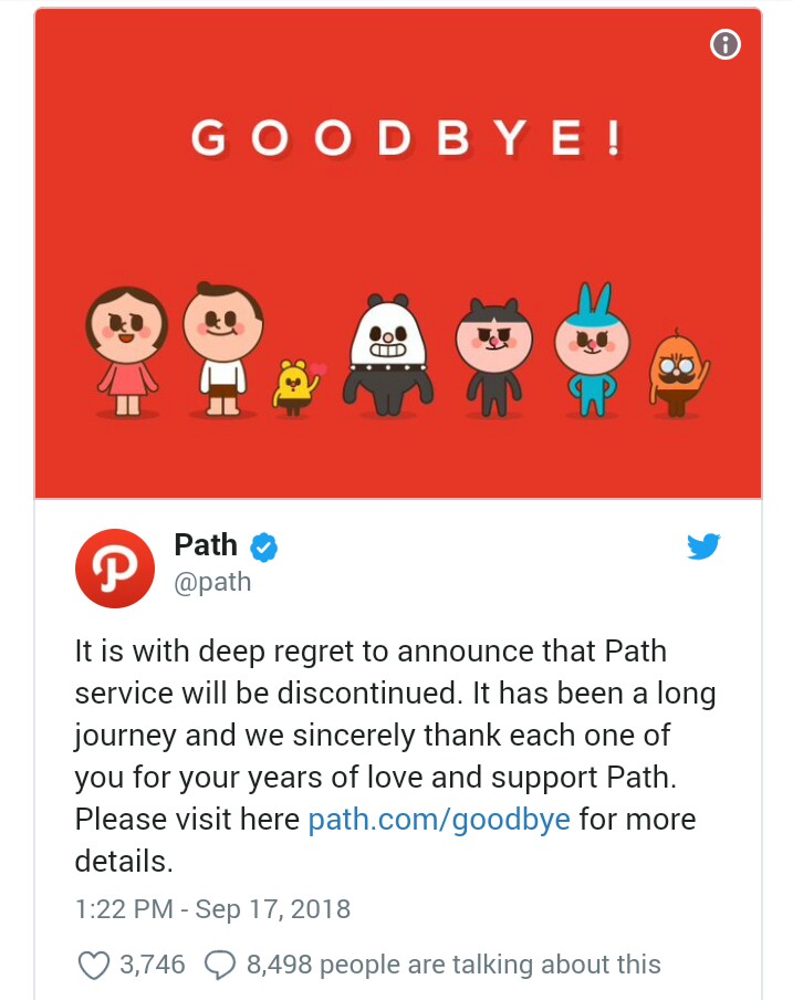 “Sepanjang perjalanan kami, kami telah tertawa dan menangis bersama Anda, dan belajar pelajaran berharga. Dan sekarang tak terhindarkan untuk mengakhiri layanan untuk memprioritaskan pekerjaan kami untuk melayani Anda dengan produk dan layanan yang lebih baik,” ungkap path.